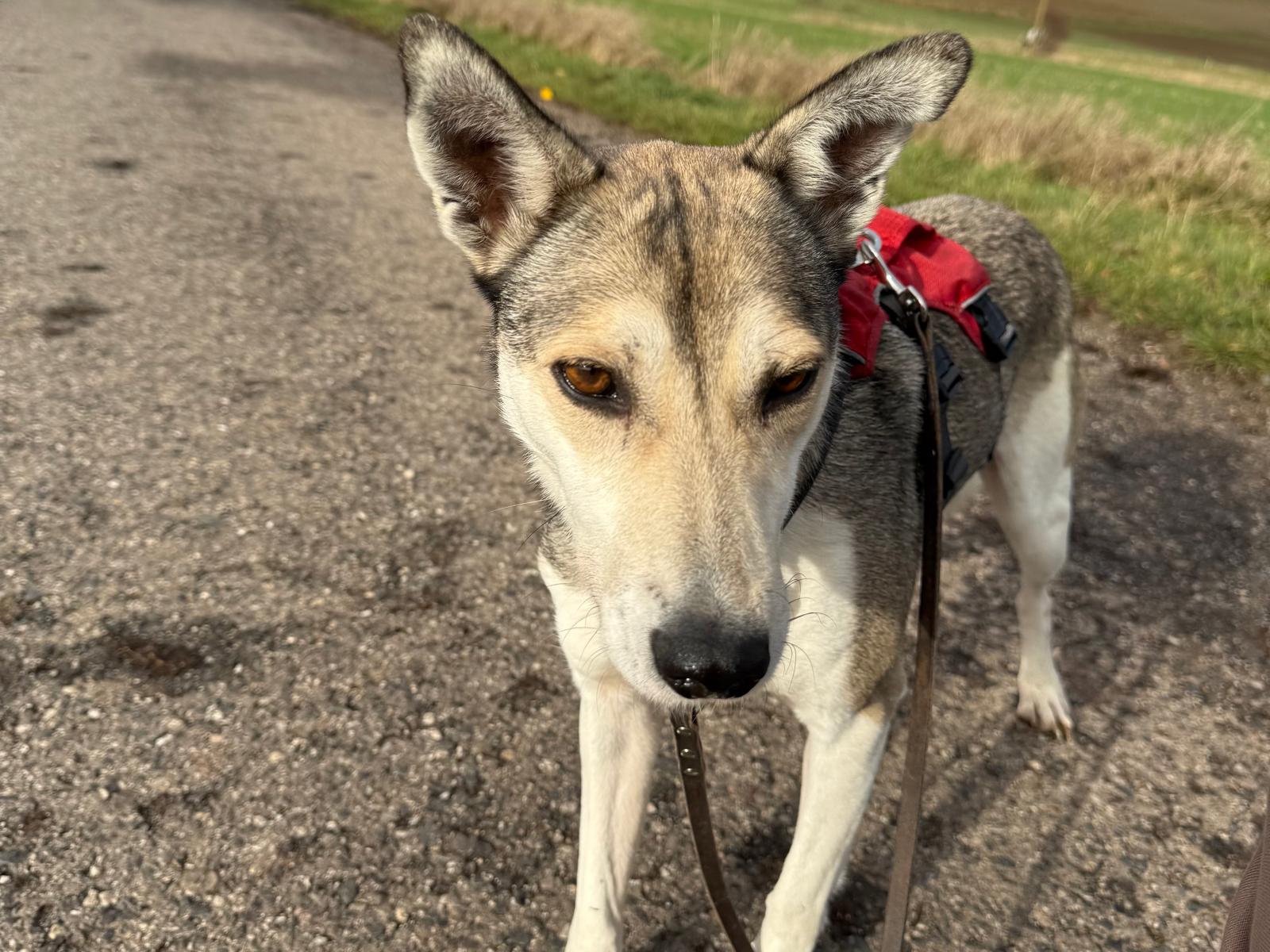 Minna, geb. 02/2020, ca. 40–45 cm groß und 15 kg schwer, ist eine Angsthündin mit Vergangenheit (erste Lebensmonate im Keller in Rumänien). Sie sucht ausschließlich angsthunderfahrene Menschen und ist kein Anfängerhund. Vermittlung nur zu vorhandenem, souveränem Hund. Sie ist stubenrein, kennt Wohnung und Außenhaltung, kann mit anderem Hund allein bleiben, lässt sich anleinen und geht gern spazieren. Katzen sind kein Problem, Kinder sollten nicht im Haushalt leben. Ruhige Umgebung notwendig. Im Handling zeigt sie sich fair ohne Abwehrschnappen. Bei Vertrauen sind bereits weiche, freudige Verhaltensweisen sichtbar – sie hat viel Potenzial, sich zu einem stabilen Begleiter zu entwickeln.